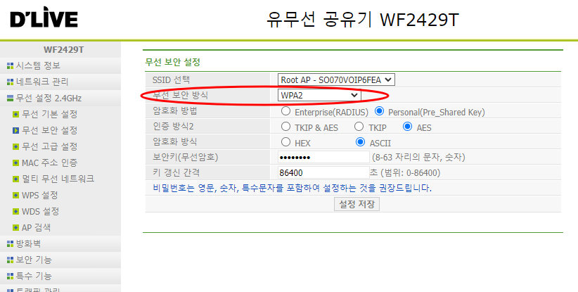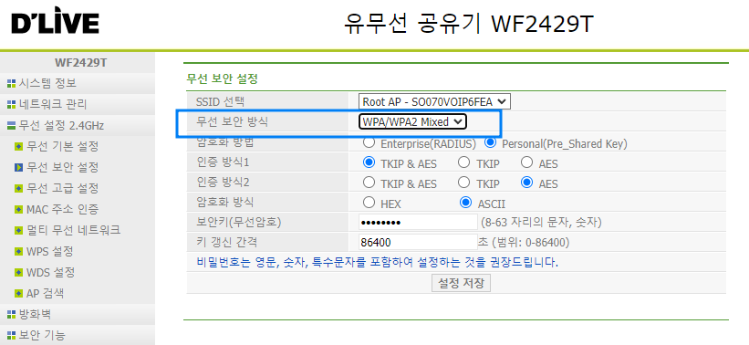 무선보안방식을 WPA/WPA2 방식에서 WPA2방식으로 바꿔주고 설정저장 하면 노트북이나 핸드폰에서 보안이 취약하다는 경고문은 안나오게된다. 무선암호를 바꾸고 싶으면 무선암호 항목에서 바꿔주면 된다.