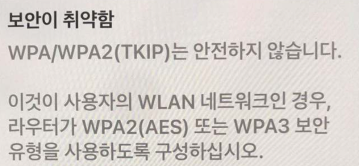 공유기 에서 무선네트워크 WIFI보안 설정이 WPA/WPA2(TKIP) 방식으로 되있으니 보안유형을 변경하라는 뜻이다.