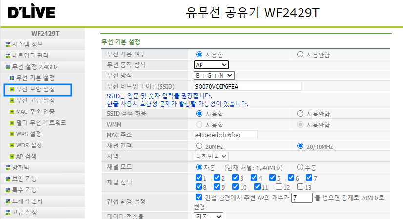 다른건 건들거없고 무선보안설정 클릭
